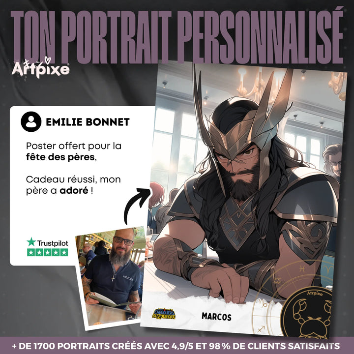 Het Chevalier du Zodiaque-portret van Artpixe is niet zomaar een eenvoudige illustratie. Het is een totale onderdompeling in de wereld die door Masami Kurumada is gecreëerd. Of het nu voor een verjaardag, Moederdag, Vaderdag of Kerstmis is, het geven van een Chevalier du Zodiaque-portret is het geven van een uniek kunstwerk dat alle fans zal verrukken.